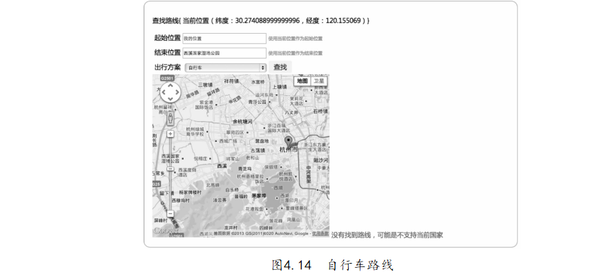 清除 文字 結(jié)果 顏色 61 directionsDisplay. setMap( map); // 在 地圖 上 顯示 路線 62 directionsDisplay. setDirections( response); // 顯示 文字 結(jié)果 63 currentMaker. setMap( null); // 清除 位置 標記 64 }else{ 65 directionsPanel. style. color = 'red'; 66 // 沒有 找到 路線 67 if( status === google. maps. DirectionsStatus. ZERO_ RESULTS){ 68 // 自行車 查找 的 特殊 處理 69 if( selectedMode === 'BICYCLING'){ 70 directionsPanel. innerHTML =' 沒有 找到 路線, 可能 是 不支持 當前 國家 '; 71 }else{ 72 directionsPanel. innerHTML = ' 沒有 找到 相關 路線 ';