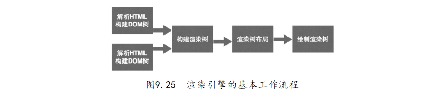 渲染也就是將頁面內(nèi)容顯示到瀏覽器屏幕上。瀏覽器的渲染引擎是一種對(duì)HTML文檔進(jìn)行解析并將其顯示在頁面上的工具。目前,Chrome、Safari、Opera瀏覽器中使用WebKit引擎,而Firefox瀏覽器中使用Gecko引擎,IE瀏覽器中使用Trident引擎。2013年4月3日,Google宣布在Chrome瀏覽器中使用新型開源渲染引擎Blink。Opera的BruceLawson也在官方博客中表示計(jì)劃改用Blink引擎。Mozilla也在Github中公布與韓國三星共同開發(fā)的Android系統(tǒng)與ARM系統(tǒng)用渲染引擎Servo。雖然各渲染引擎之間肯定存在著區(qū)別,但是當(dāng)用戶在地址欄中輸入U(xiǎn)RL地址、開始加載頁面時(shí),各渲染引擎都開始實(shí)現(xiàn)如圖9.25所示的渲染處理。
