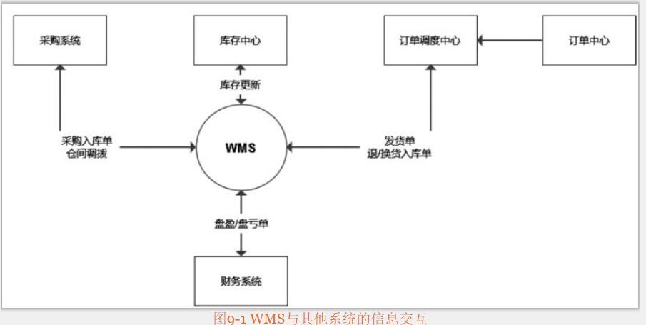 從業(yè)務(wù)上講,倉庫管理系統(tǒng)主要是出庫、入庫以及倉庫內(nèi)部管理。在整個電商后臺體系中,WMS系統(tǒng)作為進(jìn)銷存體系的重要一環(huán),需要與采購系統(tǒng)、財務(wù)系統(tǒng)、訂單調(diào)度中心、庫存中心等系統(tǒng)發(fā)生信息交互。如圖9-1所示,簡述了WMS與其他系統(tǒng)發(fā)生的信息交互。