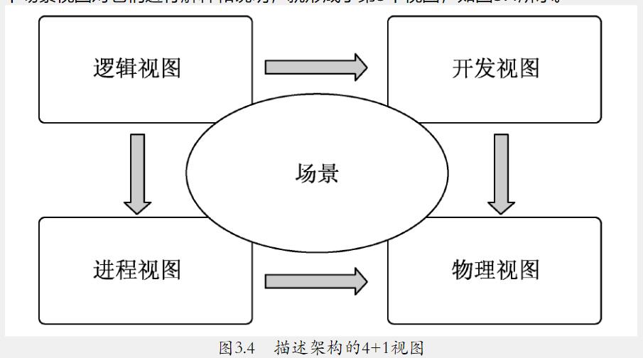 ·開(kāi)發(fā)視圖(Development View) :定義在開(kāi)發(fā)環(huán)境中軟件的靜態(tài)組織結(jié)構(gòu)。在進(jìn)行設(shè)計(jì)架構(gòu)時(shí),可以說(shuō)架構(gòu)的各個(gè)關(guān)注點(diǎn)都?xì)w結(jié)于以上4個(gè)視圖,使用一個(gè)場(chǎng)景視圖對(duì)它們進(jìn)行解釋和說(shuō)明,就形成了第5個(gè)視圖,如圖3.4所示。