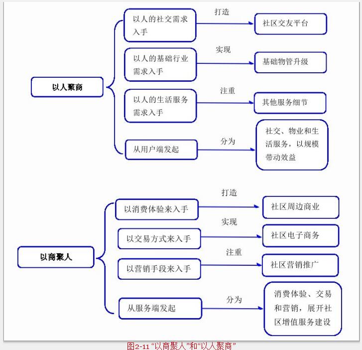 社區(qū)交友核心是打造穩(wěn)定的社區(qū)關(guān)系,首先要建立鄰里社交關(guān)系,再進(jìn)一步地開展社區(qū)廣告、生活服務(wù)、物業(yè)增值等其他業(yè)務(wù)。社區(qū)交友具有很大的市場(chǎng),人們生活的環(huán)境都是靠大家來維護(hù)的,保持良好的交友環(huán)境也是非常重要的,這有利于社區(qū)O2O商家的集中營(yíng)銷,宣傳效果也很好,由此可知社交平臺(tái)是一個(gè)很好的交互空間。社區(qū)服務(wù)O2O主要有兩個(gè)大方向,“以商聚人”和“以人聚商”。以商聚人主要體現(xiàn)在周邊生活服務(wù)、社區(qū)電子商務(wù)、社區(qū)廣告營(yíng)銷方面;而以人聚商主要體現(xiàn)在物業(yè)增值服務(wù)、社區(qū)交友、網(wǎng)絡(luò)社區(qū)論壇以及服務(wù),如圖2-11所示。