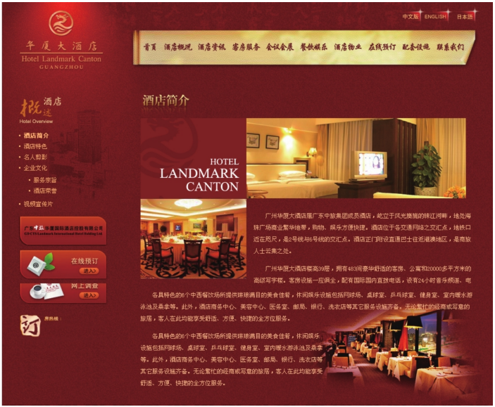 (1)華麗型:華麗型的酒店網(wǎng)站,其版面設(shè)計(jì)一般較為正規(guī)、工整,在色彩搭配上采用暗紅、黃色等顏色,以表現(xiàn)其華麗的特點(diǎn)。該類型的網(wǎng)站通常應(yīng)用在檔次較高的酒店或飯店。圖1所示為華麗的酒店網(wǎng)站。