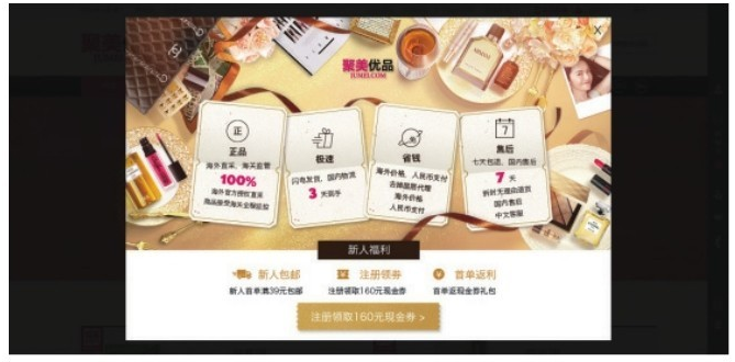 彈出式廣告按照提示的強(qiáng)弱程度可以分為強(qiáng)提示、中提示、弱提示三種類型。強(qiáng)提示是指彈出且必須強(qiáng)制用戶瀏覽完,觀看廣告期間不可關(guān)閉操作目標(biāo)頁面。由于其具有相當(dāng)大的強(qiáng)迫性,因此現(xiàn)在使用得較少;中提示使用較為廣泛,是指必須單擊關(guān)閉的圖標(biāo)按鈕才能關(guān)掉該頁面,如聚美優(yōu)品網(wǎng)站(見圖2),新用戶首次打開該網(wǎng)站時,會看到彈出廣告,在廣告下面有一個半透明的遮罩層,單擊右上角關(guān)閉圖標(biāo)才能看到首頁;弱提示相對來說較為溫和,彈出數(shù)秒后不用單擊關(guān)閉按鈕,自動關(guān)閉方便用戶瀏覽頁面。如麥包包網(wǎng)站(見圖3),新用戶首次打開該網(wǎng)站時會彈出,但即便你不單擊關(guān)閉圖標(biāo),數(shù)秒后該廣告及后面的遮罩層也會自動消失。