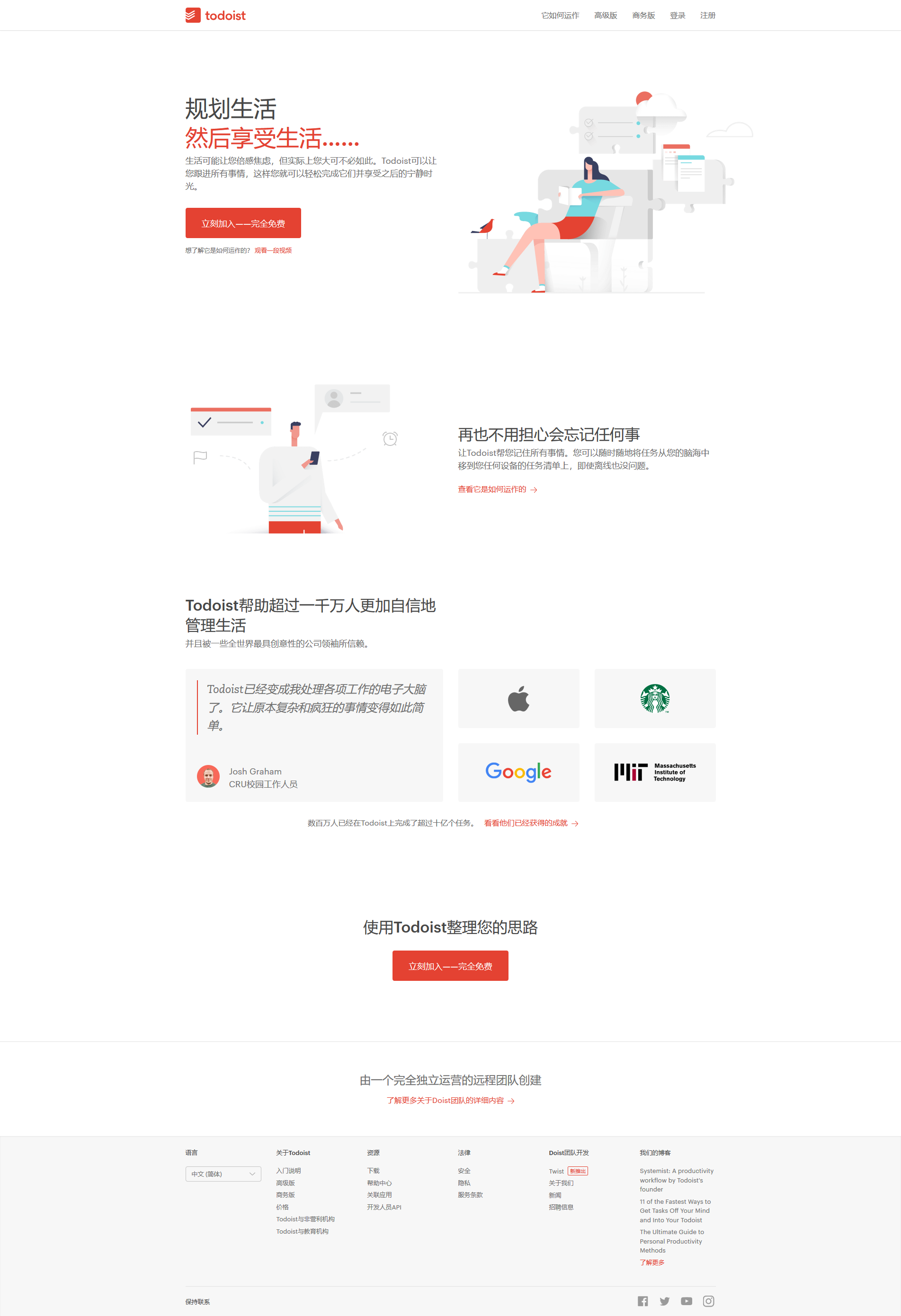 如to do 1ist官網(wǎng)(見圖1),該界面通過對比、留白和布局來打造令人難忘的均衡感,其設(shè)計每個功能特點都是一張配圖與一段文字,其中圖片所占比例大而文字較小且四處留白,這種差異會讓文字立刻吸引用戶的注意力。