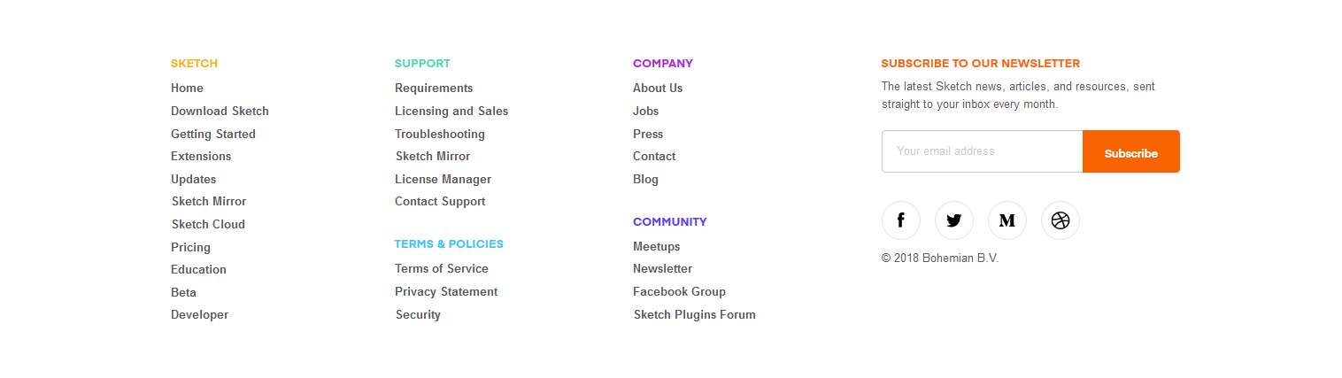 如果你再接著瀏覽,你會發(fā)現(xiàn)頁腳(見圖5.4)也采用了相似的設(shè)計。Sketch希望你在輸入郵件地址之后盡快提交,所以提交按鈕布置得同輸入框非常近。值得注意的是,提交按鈕的色彩和首屏“立即購買”按鈕的色彩保持著一致,成功吸引用戶的注意力,有效引導大家去單擊。
