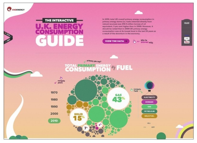 矢量類圖片是用圖形軟件繪制的。該類圖片風(fēng)格多變,尺寸大小靈活,具有很強(qiáng)的裝飾性。許多抽象圖形、圖表、圖標(biāo)都屬于矢量類圖片。如英國(guó)能源Evoenergy消費(fèi)指南網(wǎng)站(見(jiàn)圖2)中,其背景大量使用矢量插畫(huà)圖片,圖形概括,色彩搭配亮麗,將枯燥的能源消耗數(shù)據(jù)用矢量插畫(huà)的形式展現(xiàn),使得圖表信息可視化、趣味化。
