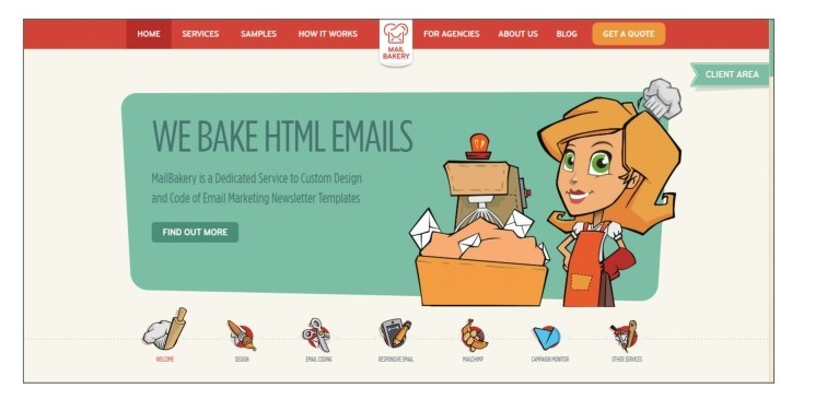再如Mailbakery網(wǎng)站(見(jiàn)圖3),它使用了大量精致的卡通矢量圖來(lái)宣傳它們定制化的郵件服務(wù)。當(dāng)鼠標(biāo)單擊并切換第一屏下方不同的導(dǎo)航圖標(biāo)時(shí),上方Banner區(qū)域就被替換成相應(yīng)的圖片內(nèi)容,令用戶容易理解,過(guò)目難忘。整個(gè)網(wǎng)頁(yè)無(wú)論是表現(xiàn)網(wǎng)站形象的Banner圖片,還是導(dǎo)航圖標(biāo)都因統(tǒng)一運(yùn)用矢量插畫(huà)的方式而令其視覺(jué)風(fēng)格上達(dá)到了高度統(tǒng)一。