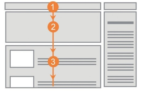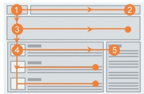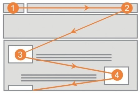 F模式(見圖1)是指用戶通常會(huì)沿著左側(cè)垂直瀏覽而下,先去尋找文章中每個(gè)段落開頭的興趣點(diǎn),這時(shí)如果用戶發(fā)現(xiàn)了他喜歡的,他就會(huì)從這里開始水平線方向的閱讀,最終結(jié)果就是用戶的視線呈F型或者E型進(jìn)行瀏覽。這種模式在一些以文字為主的網(wǎng)站較常出現(xiàn),例如新聞資訊類的網(wǎng)站、博客等。