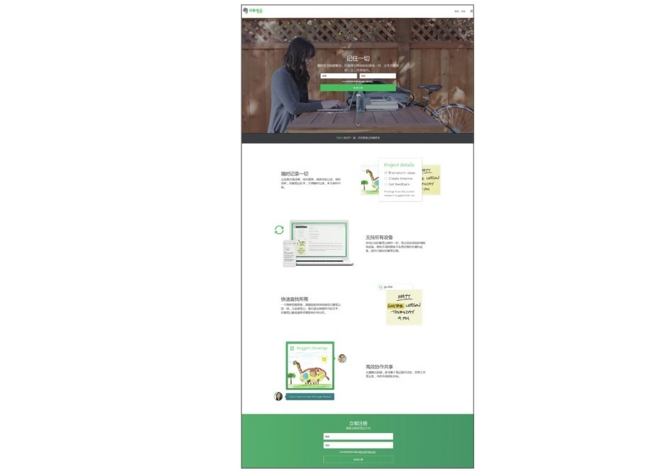 Z模式的優(yōu)點(diǎn)就是簡單,它幾乎可以適用到任何的網(wǎng)頁交互。但如果網(wǎng)站信息內(nèi)容多樣繁雜則不適用于這種模式。如印象筆記網(wǎng)站首頁(見圖4)布局上就是Z模式,第一屏為注冊(cè)登錄框,將用戶的視線牢牢地鎖定在該領(lǐng)域;接下來對(duì)該產(chǎn)品的賣點(diǎn)展示,第一行左文字右圖、第二行右圖左文字、第三行左文字右圖如此重復(fù),圖片與文字順序的更換一方面遵循了用戶的視覺流程,另一方面也有效引導(dǎo)用戶向下瀏覽,在頁面底部又為注冊(cè)登錄框,給用戶唯一的操作選擇,以達(dá)到該頁面的功能訴求。