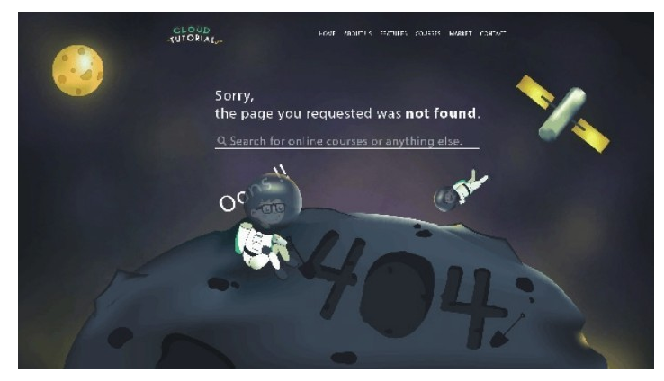 這種特定的頁面主要包括錯誤或不存在的頁面及加載等待頁面。如cloud-tutorial網的錯誤頁面(見圖3),界面中繪制了一個宇航員迷路在太空中求肋,動態(tài)圖片十分生動地反映出你現(xiàn)在處于網站的邊緣地段,此時溫馨地出現(xiàn)了一個搜索框,幫助用戶找到其他感興趣的信息。