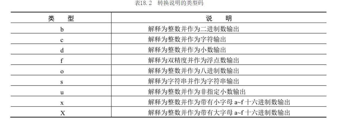 表18.2 轉(zhuǎn)換說明的類型碼當(dāng)在類型轉(zhuǎn)換代碼中使用printf()函數(shù)時(shí),參數(shù)的順序并不一定要與轉(zhuǎn)換說明中的順序相同。