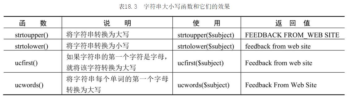 ★ 字符串大小寫可以重新格式化字符串中的字母大小寫。例如,如果電子郵件中的主題行字符串是以$subject開始,可以通過幾個(gè)函數(shù)來改變它的大小寫。這些函數(shù)的功能概要如表18.3所示。該表的第一列顯示了函數(shù)名,第二列描述了它的功能,第三列顯示了如何在字符串$subject中使用它,最后一列顯示了該函數(shù)的返回值。
