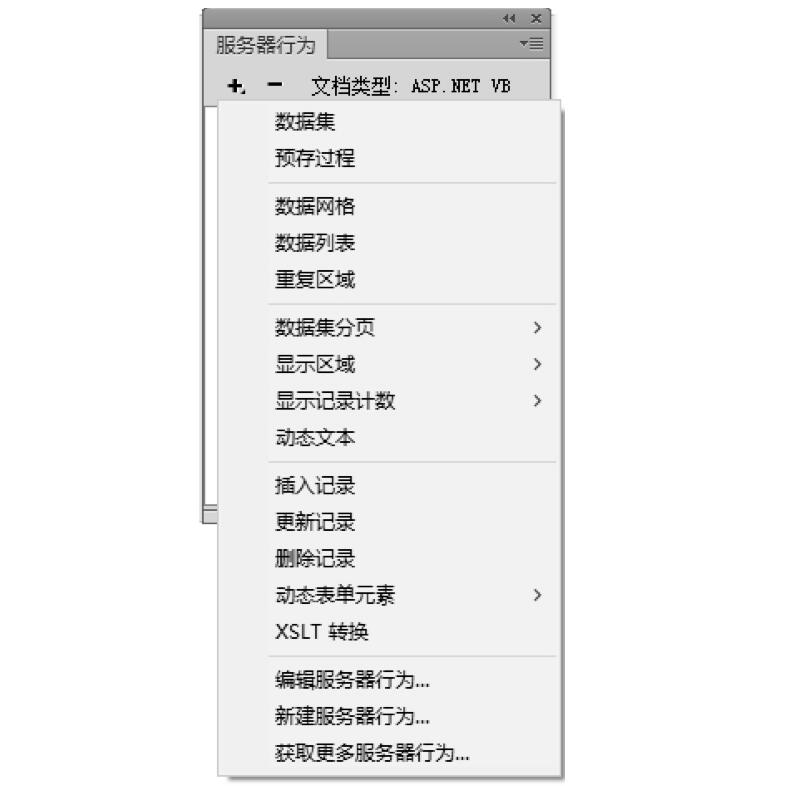 會(huì)顯示已添加的“服務(wù)器行為”列表,單擊面板上的加號(hào)(+)按鈕,并從彈出的菜單中選擇服務(wù)器行為,如圖3 -34所示。