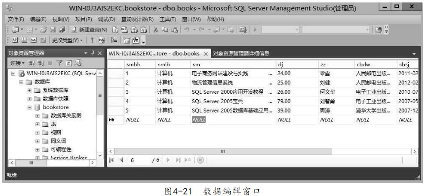(1)在SQLServerManagementStudio中,展開“數(shù)據(jù)庫”節(jié)點,選中要使用的數(shù)據(jù)庫如bookstore,然后展開該數(shù)據(jù)庫的“表”節(jié)點,用鼠標右鍵單擊要添加數(shù)據(jù)的表如books表。在彈出的快捷菜單中選擇“編輯前200行”命令,如圖4-20所示。