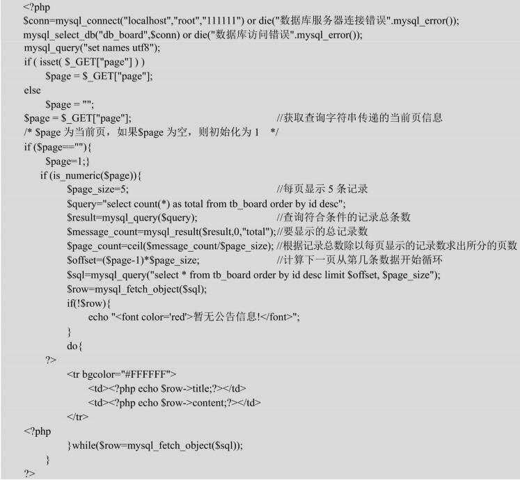 第2步,新建page.php頁面,在該頁面中使用SELECT語句檢索出全部的公告信息,使用do…while循環(huán)語句通過表格形式輸出顯示,具體代碼如下: