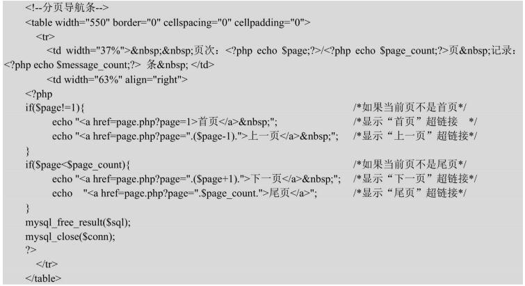 第3步,在頁面底部添加分頁導(dǎo)航信息和導(dǎo)航超鏈接,具體代碼如下: