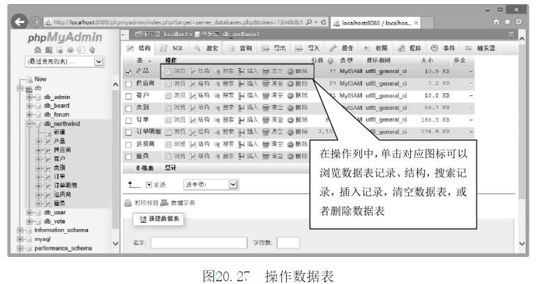 第2步,進(jìn)入數(shù)據(jù)庫以后,現(xiàn)在左邊的側(cè)邊欄里顯示著數(shù)據(jù)庫的各個(gè)表,單擊就可以進(jìn)入,也可以單擊右邊的圖標(biāo),如圖20.27所示。