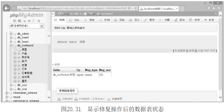 第3步,執(zhí)行修復(fù)操作之后,phpMyAdmin會顯示修復(fù)狀態(tài)信息,顯示當(dāng)前數(shù)據(jù)表被修復(fù)的情況,如圖20.31所示。