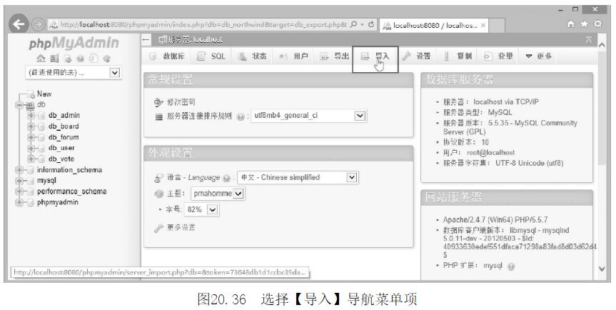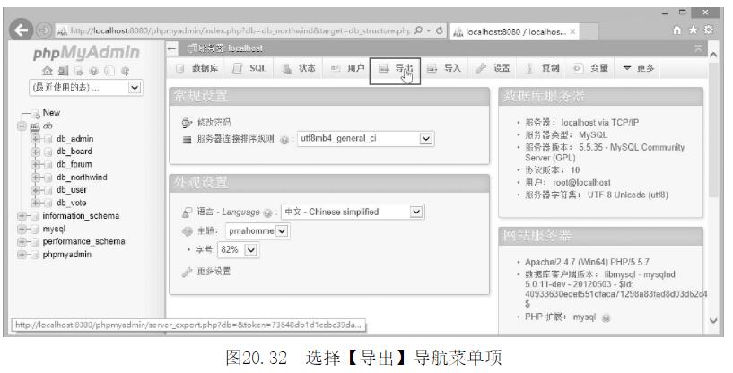 第1步,啟動(dòng)phpMyAdmin,登錄之后進(jìn)入phpMyAdmin首頁,在首頁右側(cè)內(nèi)容區(qū)域主導(dǎo)航欄中單擊【導(dǎo)出】鏈接選項(xiàng),如圖20.32所示。