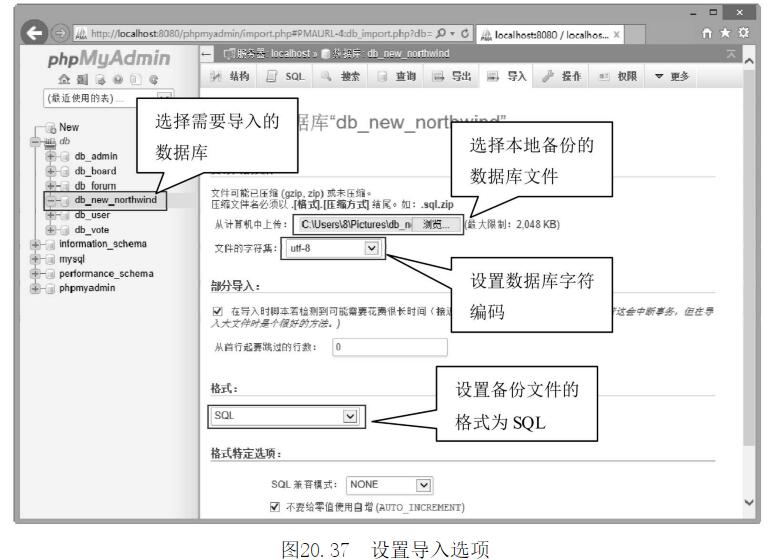 第3步,在頁面左側(cè)數(shù)據(jù)庫列表中,選擇新建的數(shù)據(jù)庫,在右側(cè)內(nèi)容區(qū)域單擊【瀏覽】按鈕,瀏覽文件位置,選擇一個(gè)數(shù)據(jù)庫文件(db_northwind.sql),注意擴(kuò)展名為sql,然后設(shè)置文件的字符編碼,確保與備份數(shù)據(jù)庫字符編碼一致,設(shè)置“格式”為SQL,設(shè)置如圖20.37所示。深圳網(wǎng)站設(shè)計(jì)公司提示:在瀏覽位置右側(cè)有最大限制2MB的提示,它表明phpMyAdmin默認(rèn)導(dǎo)入的最大文件大小限制為2MB,如果希望phpMyAdmin導(dǎo)入大文件,最簡單的方法是修改php.ini配置文件中文件上傳大小的配置。