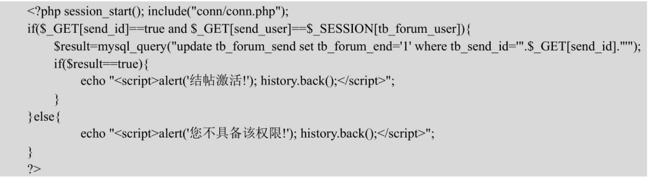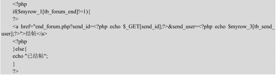 在end_forum.php文件中,執(zhí)行結(jié)帖的操作,以$send_id變量傳遞的帖子ID值為依據(jù),程序代碼如下(end_forum.php):