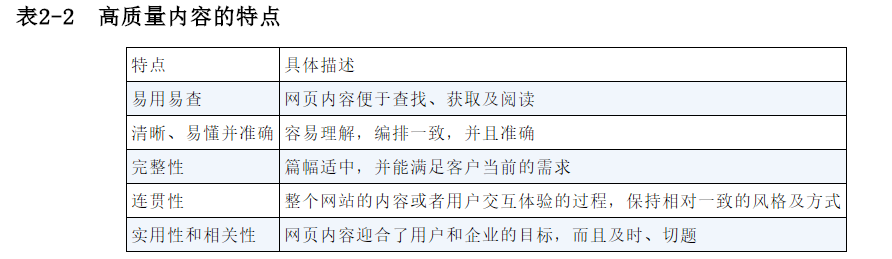 表2-2 高質(zhì)量?jī)?nèi)容的特點(diǎn)特點(diǎn)具體描述易用易查網(wǎng)頁(yè)內(nèi)容便于查找、獲取及閱讀清晰、易懂并準(zhǔn)確容易理解,編排一致,并且準(zhǔn)確完整性篇幅適中,并能滿足客戶當(dāng)前的需求連貫性整個(gè)網(wǎng)站的內(nèi)容或者用戶交互體驗(yàn)的過(guò)程,保持相對(duì)一致的風(fēng)格及方式實(shí)用性和相關(guān)性網(wǎng)頁(yè)內(nèi)容迎合了用戶和企業(yè)的目標(biāo),而且及時(shí)、切題創(chuàng)建高質(zhì)量的內(nèi)容和制定內(nèi)容策略一樣需要周密的思考。需要做的不只是隨便寫(xiě)寫(xiě)文章或貼貼圖片,而更需要一些充分詳實(shí)的準(zhǔn)備工作。好了,網(wǎng)站設(shè)計(jì)公司本文關(guān)于“網(wǎng)站設(shè)計(jì)公司淺析好的網(wǎng)站內(nèi)容重要性有多大?”的知識(shí)分享就到這里,謝謝關(guān)注,我們希望這類型的網(wǎng)站設(shè)計(jì)以及網(wǎng)站營(yíng)銷知識(shí)能給您的工作有所幫助。博納網(wǎng)絡(luò)編輯整理。[聲明]本網(wǎng)轉(zhuǎn)載網(wǎng)絡(luò)媒體稿件是為了傳播更多的信息,此類稿件不代表本網(wǎng)觀點(diǎn),本網(wǎng)不承擔(dān)此類稿件侵權(quán)行為的連帶責(zé)任。故此,如果您發(fā)現(xiàn)本網(wǎng)站的內(nèi)容侵犯了您的版權(quán),請(qǐng)您的相關(guān)內(nèi)容發(fā)至此郵箱【qin@198bona.com 】,我們?cè)诖_認(rèn)后,會(huì)立即刪除,保證您的版權(quán)。