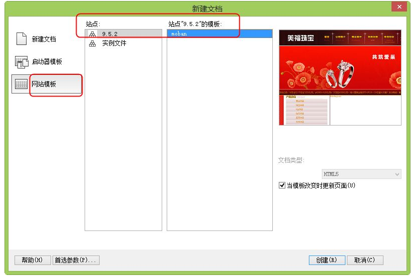 ?選擇菜單中的【文件】|【新建】命令,彈出【新建文檔】對話框,在對話框中選擇【網(wǎng)站模板】選項(xiàng),選擇【站點(diǎn)9.5.2】選項(xiàng)中的【moban】,如圖9-82所示。
