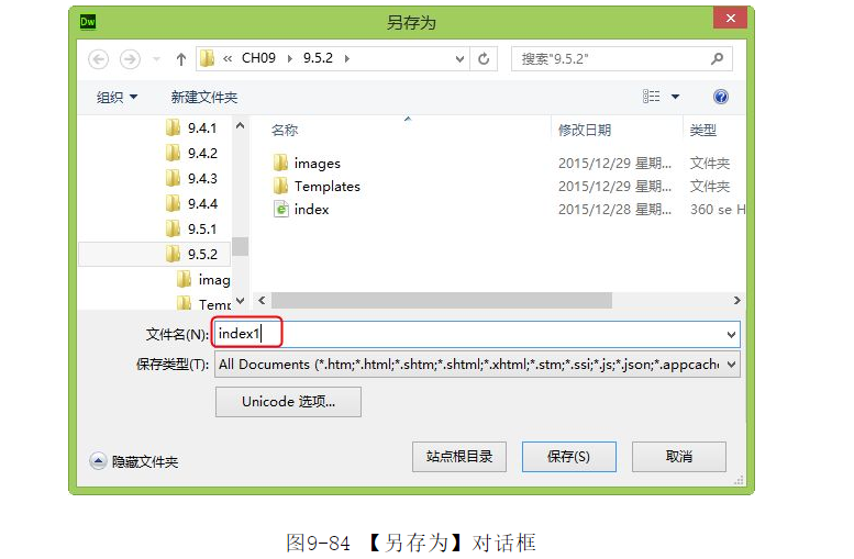 ?選擇菜單中的【文件】|【保存】命令,彈出【另存為】對話框,將文件保存為index1,如圖9-84所示。