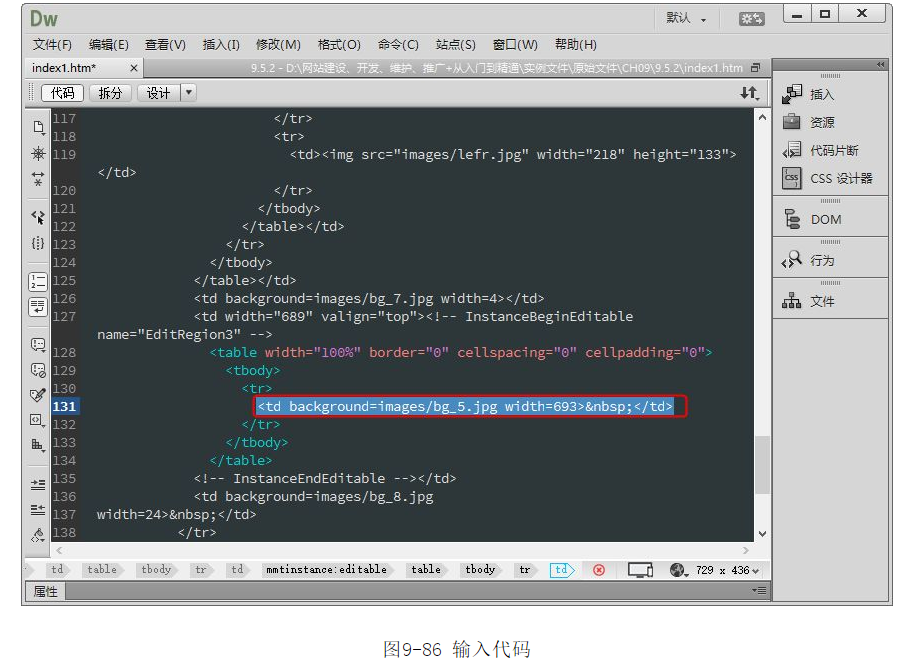 ?將光標(biāo)置于表格的單元格中,打開代碼視圖,在代碼中輸入背景圖像代碼background=images/bg_5.jpg,如圖9-86所示。