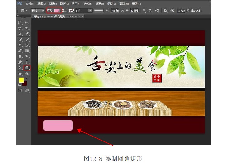 ?選擇工具箱中的圓角矩形工具,將【半徑】設(shè)置為10像素,按住鼠標(biāo)左鍵的同時(shí)拖動(dòng)鼠標(biāo),繪制一個(gè)圓角矩形,如圖12-8所示。