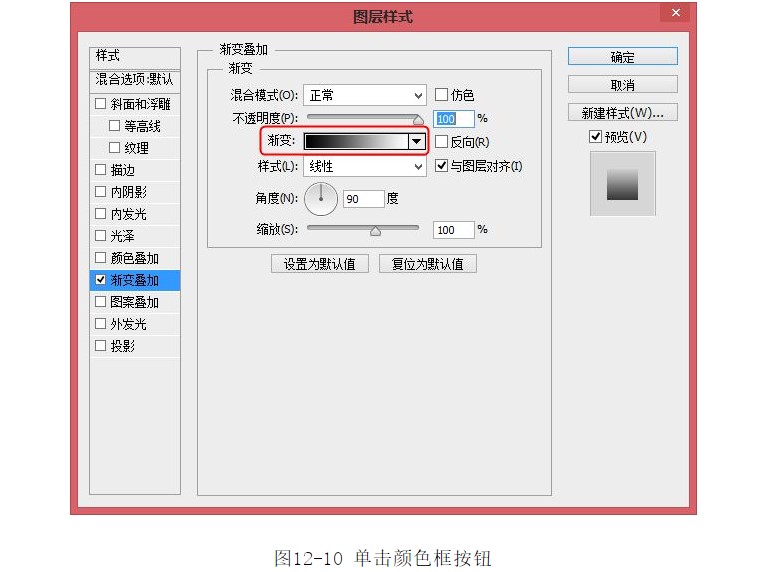 ?彈出【圖層樣式】對(duì)話框,單擊漸變后面的顏色框按鈕,如圖12-10所示。
