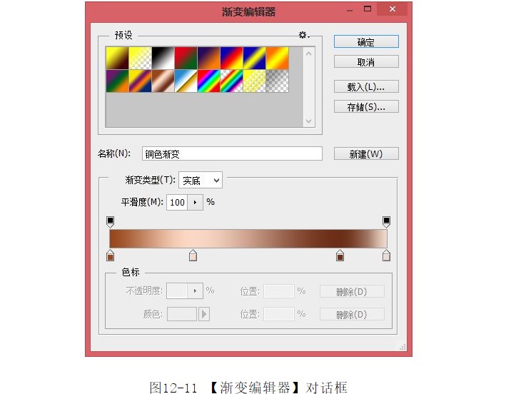 ?打開【漸變編輯器】對(duì)話框,設(shè)置漸變顏色,如圖12-11所示。