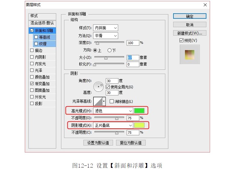 ?在對(duì)話框中選擇【斜面和浮雕】選項(xiàng),設(shè)置【高光模式】和【陰影模式】的顏色,如圖12-12所示。