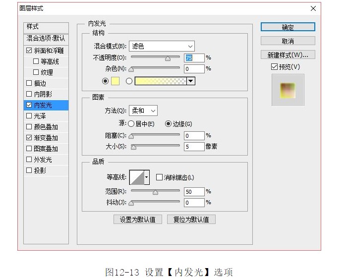 ?在對(duì)話框中選擇【內(nèi)發(fā)光】選項(xiàng),將其參數(shù)設(shè)置為如圖12-13所示。