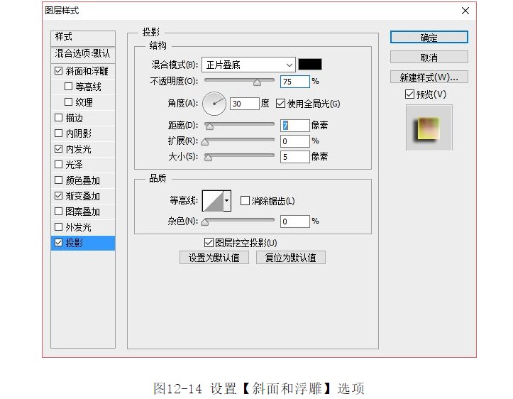 ?在對(duì)話框中選擇【斜面和浮雕】選項(xiàng),將其參數(shù)設(shè)置為如圖12-14所示。