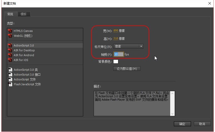 ?在對(duì)話框中將尺寸【寬】設(shè)置為890像素,【高】設(shè)置為310像素,【幀頻】設(shè)置為10fps,單擊【確定】按鈕,新建文檔,如圖13-9所示。