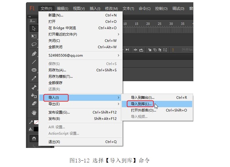 ?選擇菜單中的【文件】|【導(dǎo)入】|【導(dǎo)入到庫(kù)】命令,如圖13-12所示。
