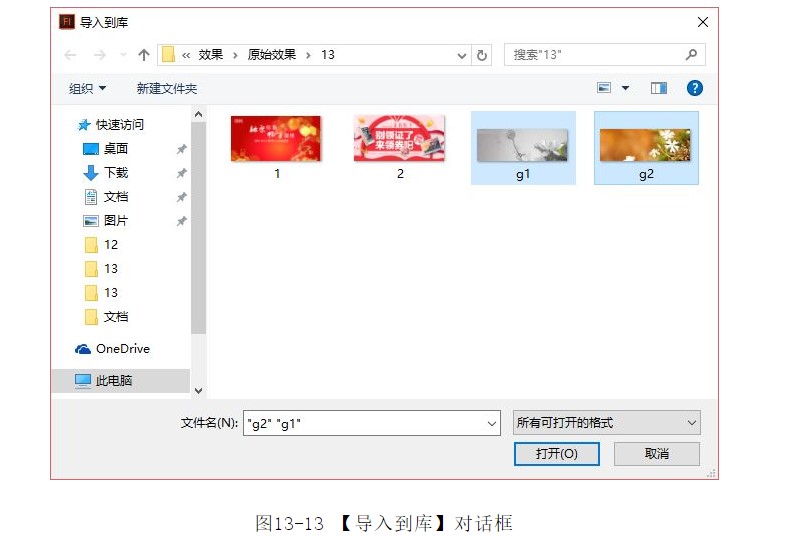 ?彈出【導(dǎo)入到庫(kù)】對(duì)話框,在對(duì)話框中選擇導(dǎo)入的圖像文件“g1.jpg”和“g2.jpg”,如圖13-13所示。