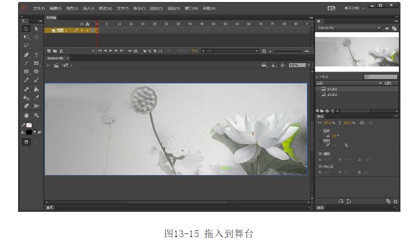 ?選中圖層1的第1幀,將【庫(kù)】面板中的圖像“g1.jpg”拖入到舞臺(tái),如圖13-15所示。