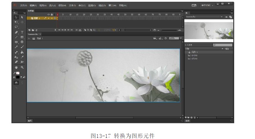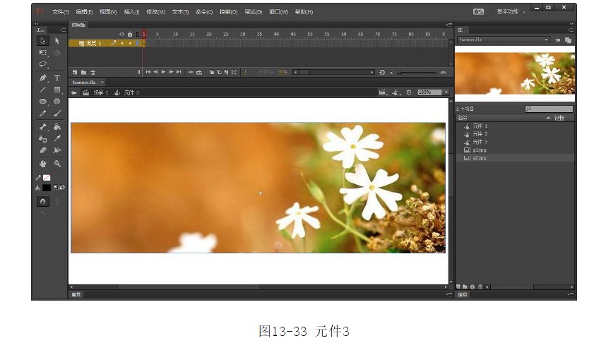25.選擇菜單中的【插入】|【新建元件】命令,彈出【創(chuàng)建新元件】對(duì)話框。在對(duì)話框中輸入元件的名稱“元件3”,【類型】選擇【圖形】,如圖13-32所示。26.單擊【確定】按鈕,進(jìn)入元件3的編輯模式。從庫(kù)面板中將圖像“g2.jpg”拖入編輯區(qū),調(diào)整其位置,如圖13-33所示。