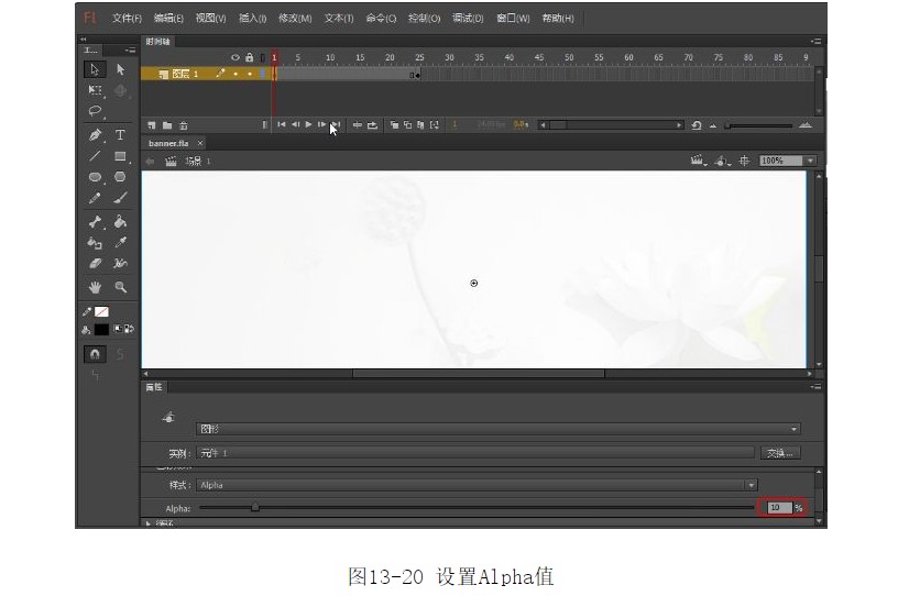 ?選中第1幀,在【屬性】面板中將【樣式】選擇Alpha,將Alpha值設(shè)置為10%,如圖13-20所示。