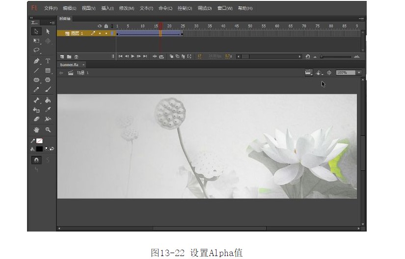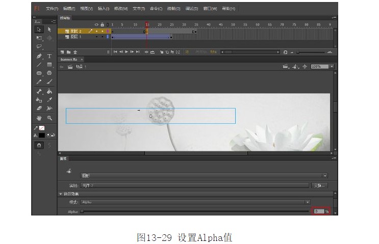 22.選中第15幀,選中元件2,將【樣式】的Alpha值設(shè)為0%,如圖13-29所示。