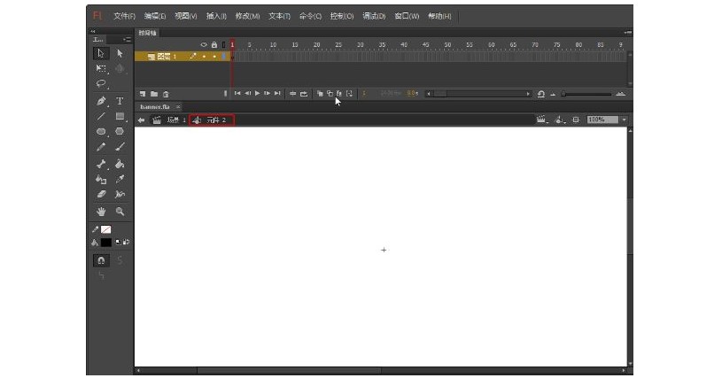 ?在對(duì)話框中的【名稱】文本框中輸入文字“元件2”,【類型】選擇【圖形】,單擊【確定】按鈕,進(jìn)入元件2的編輯模式,如圖13-24所示。