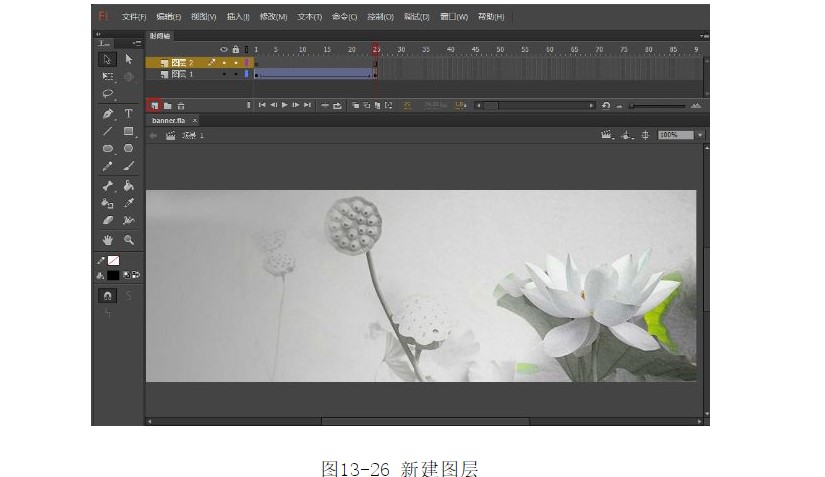 ?單擊【場(chǎng)景1】進(jìn)入主場(chǎng)景中,單擊在圖層的下方【新建圖層】按鈕,新建圖層2,如圖13-26所示。