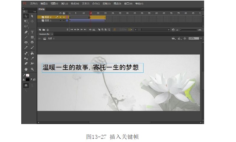 ?選中第15幀,按F6鍵插入關(guān)鍵幀。從庫(kù)面板中將元件2拖入到舞臺(tái)中,并調(diào)整其位置,如圖13-27所示。