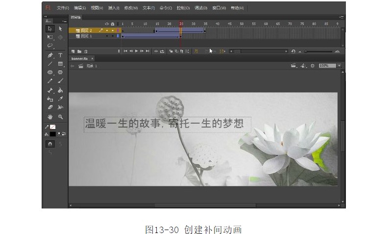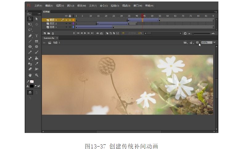 23.在第15幀~35幀之間,單擊鼠標(biāo)右鍵,在彈出菜單中選擇【創(chuàng)建傳統(tǒng)補(bǔ)間動(dòng)畫(huà)】選項(xiàng),創(chuàng)建補(bǔ)間動(dòng)畫(huà),如圖13-30所示。