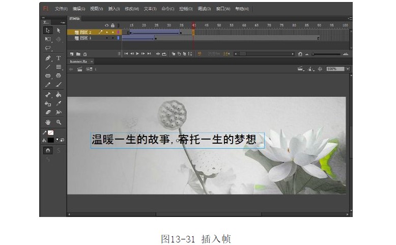 24.選中圖層1的第90幀,按F5鍵插入幀。選中圖層2的第40幀,按F5鍵插入幀,如圖13-31所示。