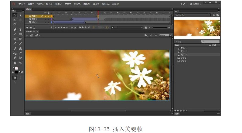 28.選中第35幀,按F6鍵插入關(guān)鍵幀。從【庫(kù)】面板中將元件3拖入到舞臺(tái)中,并調(diào)整其位置,如圖13-35所示。