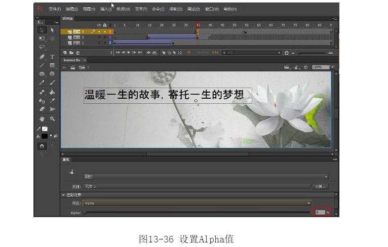 29.選中第55幀,按F6鍵插入關(guān)鍵幀。選擇第35幀,在【屬性】面板中將【顏色】的Alpha值設(shè)置為0%,如圖13-36所示。