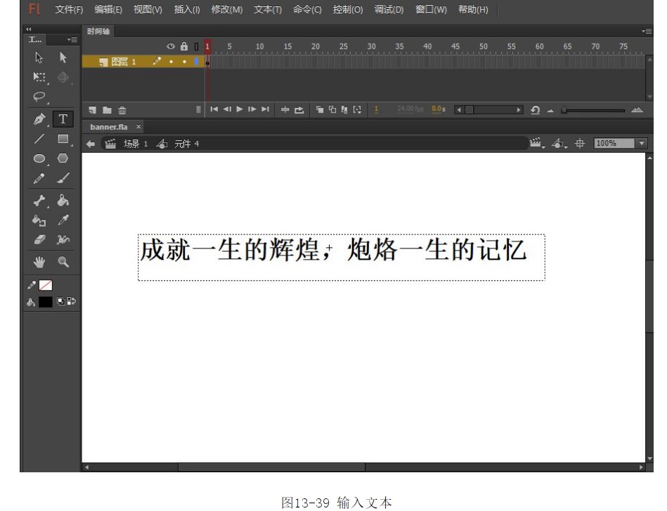 31.選擇菜單中的【插入】|【新建元件】命令,彈出【創(chuàng)建新元件】對(duì)話框,在對(duì)話框中輸入元件的名稱“元件4”,【類型】選擇【圖形】,如圖13-38所示。32.單擊【確定】按鈕,進(jìn)入元件4的編輯模式。選擇工具箱中的文本工具,在舞臺(tái)中輸入文字,并調(diào)整其位置,如圖13-39所示。